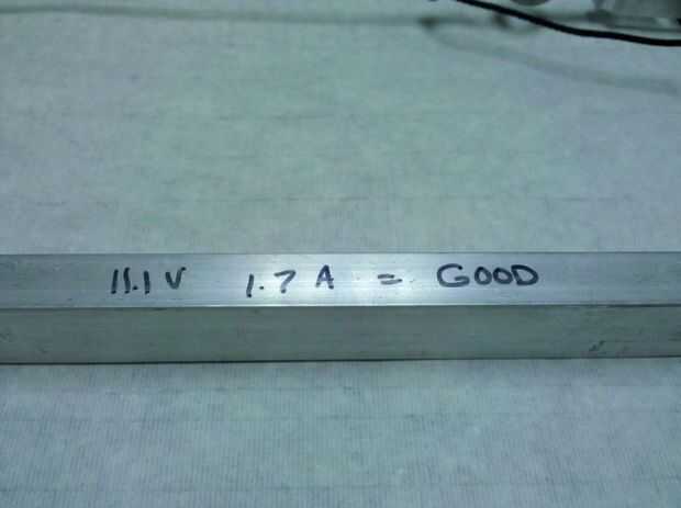 Idealmente podría tener una fuente de corriente continua variable. En mi caso bombeo 11,1 voltios @ 1,7 amperios hizo el truco. Variando el voltaje cambiará la corriente. (V = I * R) La potencia (P = I * V) determina la temperatura del alambre. Más corriente, los electrones más movimiento y destrozo en el cable (resistencia) y tal modo calentar.