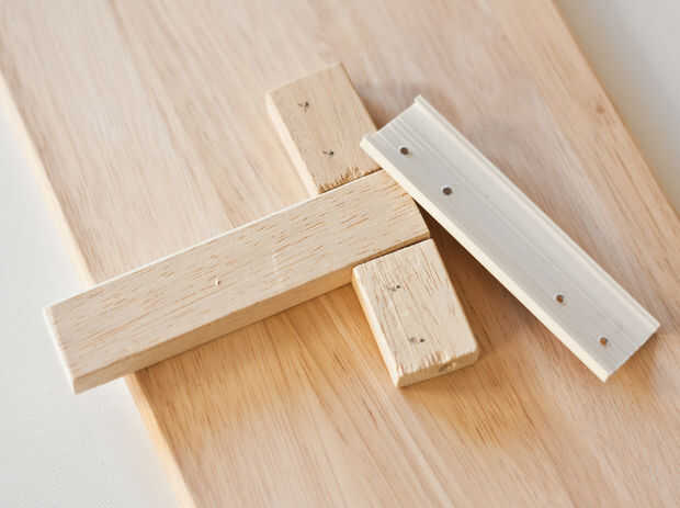 Un par de largos tornillos actos como unión entre el brazo de madera. Así que corte un par de pedazos de madera 3 x 2 x 1 cm y, aproximadamente 7 mm de la frontera, taladre un agujero en la dirección del eje más largo. Disponer las piezas sobre una superficie plana y marque la posición de los agujeros de la tapa del conducto. Luego Taladre los cuatro agujeros para los tornillos.