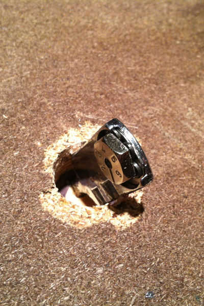 Usar un trozo de madera contra la cuchilla y martillo en el marco, coloque la tapa de madera contrachapada sobre el cortador empujando el cortador a través del orificio. Tenga cuidado de no golpear la rueda de corte cuando se conduce el cortador en.