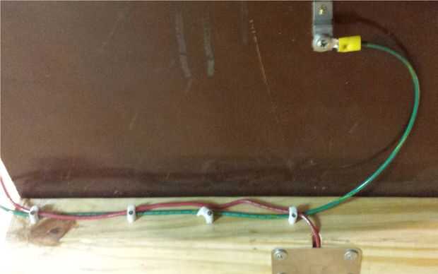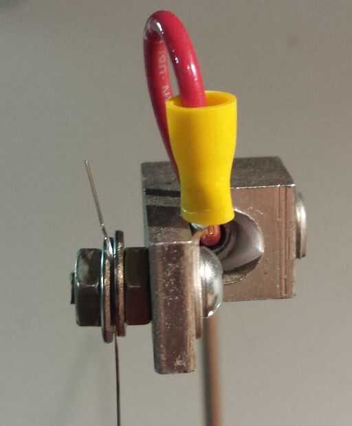 Como se dijo antes, os adjunto uno de los cables a la zapata inferior y después alimenté el otro cable a través del tubo con el otro conector del anillo en la parte superior de la armadura.