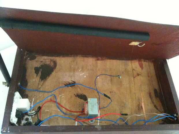 Todo según el diagrama con uno de los cables del transformador a la lavadora en el brazo de alambre y y la otra forma de alambre el transformador debe pasar por la otra arandela. Ahora esta lavadora debe tener el attched de alambre de Nicromio escúchelo... que pasa a través de un agujero perforado a través de la tapa.. .y entonces atado al gancho (aquí no es necesario añadir la primavera a pesar de que hice... el brazo tiene suficiente de la primavera!)
