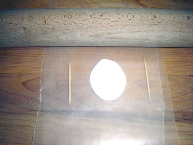 Coloque el Sugru entre las dos hojas de papel encerado y luego a cada lado, dos palillos o pinchos de kebab (algo que es del mismo grosor como funciona tu sello de goma previsto). La idea aquí es que al pasar por el Sugru con su perno de balanceo, los escarbadientes permitirá la forma de amasar un espesor uniforme en toda la superficie de la Sugru.