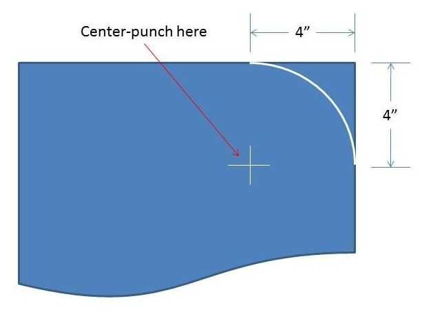 Tenemos un lápiz es porque usamos un punzón para localizar el centro del radio que queremos cortar. Si quieres redondear la esquina de un pedazo de metal, determinar el radio que desea medir a distancia de los dos bordes y punzón la intersección. Vea la ilustración.