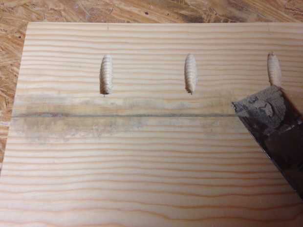 quería que la base para ser una plaza para un montón de habitación, así que medí el tamaño debe ser por la longitud de la hoja de sierra. Pude utilizar una longitud de 1 x 7 y una pieza parcial de 1 x 7 que tuvieron que ser conectados entre sí. Luego usé los agujeros de bolsada para conectar los dos tableros. La parte superior de la articulación resultó suave, pero de alguna manera la parte inferior de la articulación tenía un labio muy leve. Así que llena las grietas e imperfecciones con masilla para madera y lija todo abajo, dando un ligero redondeo en las esquinas y bordes.