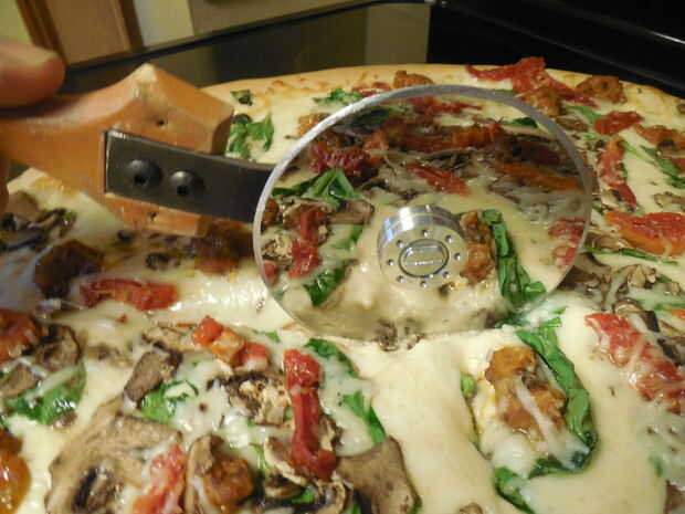 Aquí está mi opinión sobre un cortador de pizza, es una divertida manera de cortar la pizza y una gran conversación de arranque.Lo mejor de todo que es hecho totalmente a mano, de un pequeño sobrante y un plástico re-purposed maneja cortador de la pi
