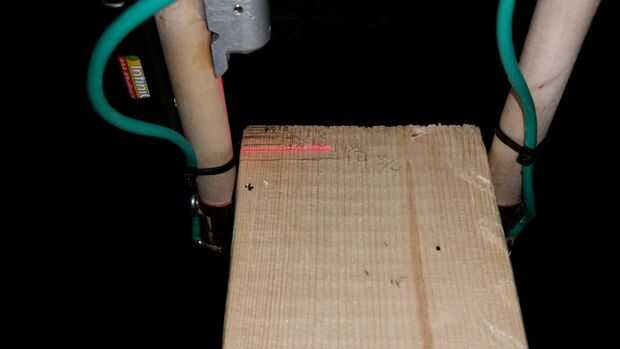 Ahora fue todo lo posible y ha añadido un puntero láser para saber qué altura estoy en el, pero realmente un lápiz marca en el brazo va a hacer. Como te retiras el dispositivo, la brecha de obtener menor, medir el espacio entre el alambre de la base, que actúa como cara de referencia paralelo, medir la distancia y la escritura, en la base, cuál es la altura correspondiente al ángulo. De esta manera usted puede hacer ajustes rápidos.