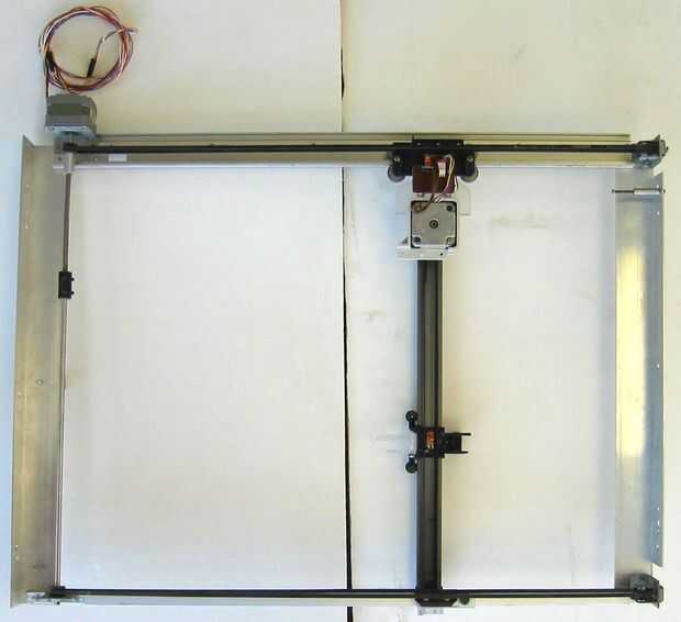 Un motor más pequeño de steper en el pórtico desplaza el-y-fro de carro de pluma en el pórtico. Zach substituyó el sostenedor de la pluma con un soporte para espejo # 4 y la lente de concentración. Con el tiempo Zach había sustituido elementos frame con extrusiones de aluminio y varios soportes con piezas de lasercut lucite.