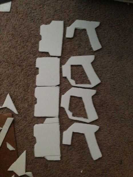 Coloque la plantilla sobre el tablero de la espuma. Trazar sobre el tablero y cortar la forma. Que terminé tener que hacer frente y vuelta separados y colocar durante la Asamblea, como estaba usando trozos de espuma de un proyecto anterior. Repetir varias veces para hacer unos 4 de la forma, dependiendo de cómo densamente el tablero es y cómo gruesas desea el apoyo que. Mi 4 piezas no son todas idénticas, para crear profundidad y detalles, pero sólo puede añadir estos detalles durante el montaje.
