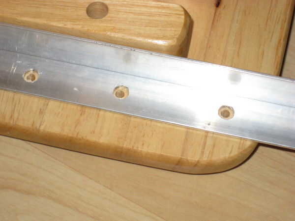 Con los agujeros hechos, agrandamiento de los agujeros en la tira de aluminio para que los tornillos caería justo en.  Yo también había agrandado los agujeros un poco en la bandeja de la TV para los tornillos.  Puse un pequeño trozo de tap en la broca que he utilizado asi que no se perforar muy profundo.