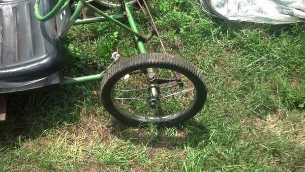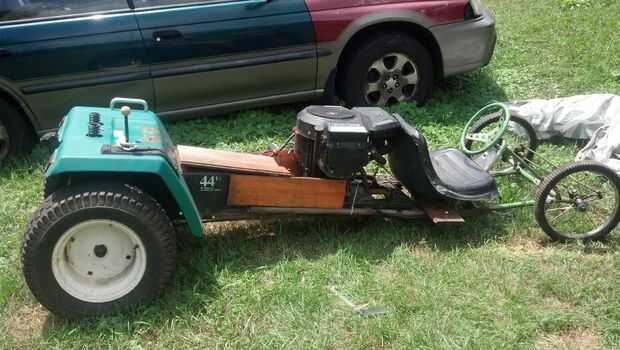 He hecho algunos experimentos y encontró que en el acelerador a fondo, rollos en cerca de 15 MPH. También he añadido algunas nuevas llantas y una tapa de tanque de gas de la segadora antigua por lo que un pasajero puede viajar en la parte posterior.
