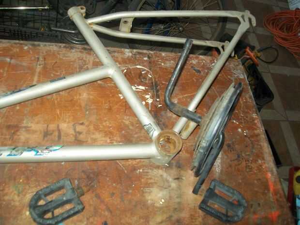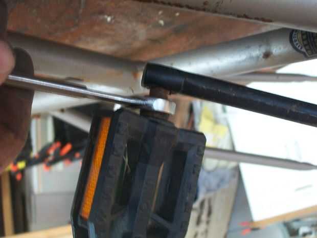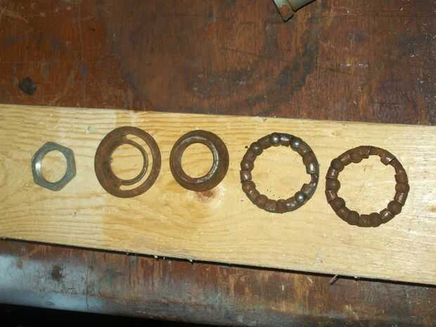 entonces remoce la tuerca con alicates comunes de la costilla (o una llave muy grande si lo tienes). ahora necesitará aflojar el cono del rodamiento con un destornillador hasta que puede ser a mano. Ahora del hilo de rosca del cono en el brazo de la biela con la mano. Los rodamientos de este lado de la Asamblea inestable deben deslizar fácilmente en este punto. A continuación retire toda la Asamblea, teniendo cuidado de mantener los otros rodamientos.