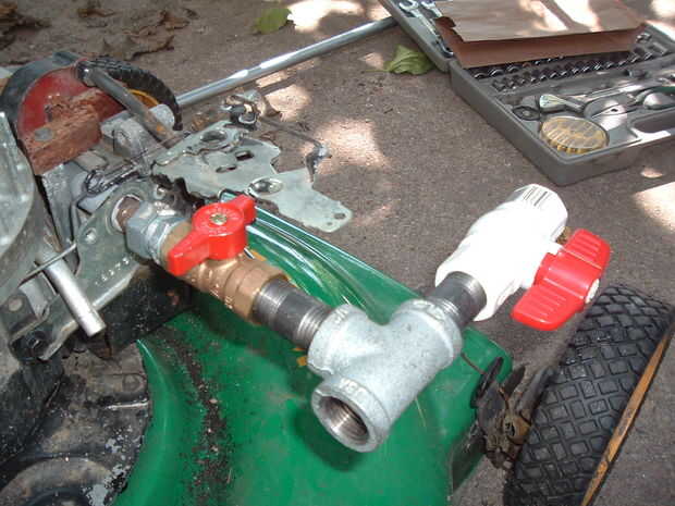 Carburadores del medidor del flujo de aire y combustible al motor. Utilicé una combinación de fontanería, gas y guarniciones del conducto eléctrico para hacer este trabajo. tubo de cobre de 1/2 pulgadas encajan perfectamente en el tubo de admisión del motor; a las soldado un racor de rosca. Y la armadura, os adjunto una válvula de gas de cobre amarillo como el control del acelerador.