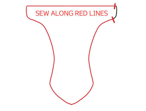Consulte el diagrama y coser a lo largo de los bordes de la tela, como señalado por las líneas rojas, dejando un espacio en el extremo de una de las aletas (no importa cuál).