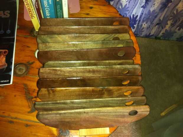 Normalmente usar nuez negra, cereza, rojo y blanco roble para esto. De corteza fina corteza demasiado gruesa te cortó a todos. Después he cortado mi pizza y yo sólo límpielo con una toalla húmeda. No lavarse en lavavajillas. Son único y hermoso si quieres ver más entra a carpintería SOD de Todd en Facebook.