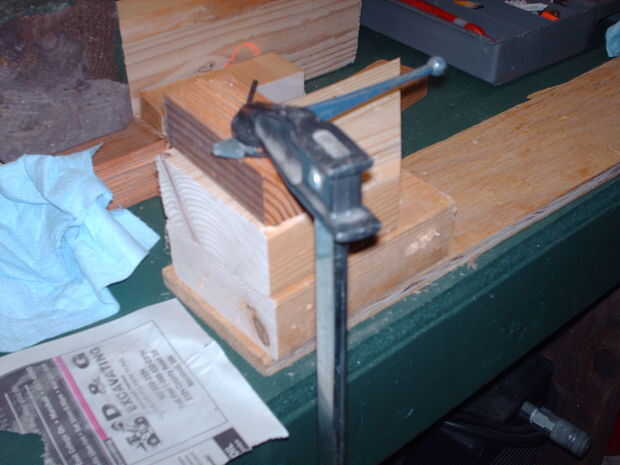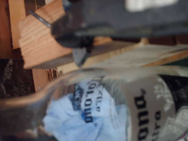 Como veis en la foto, yo solía una abrazadera Sujete el cortador de vidrio a un montón de chatarra de piezas a la altura que quería cortar el cristal de madera. Con un montón de presión y mantener el fondo del vaso en el suelo, me volví el vidrio contra la herramienta de corte para crear un arañazo en el cristal.