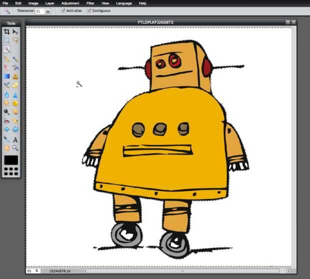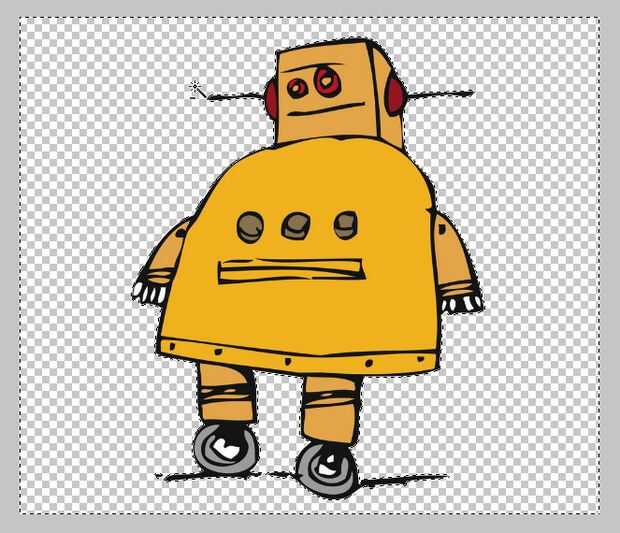 Las imágenes más fácil alterar son como la ilustración de la robusteza de Instructables, que es básicamente una colección de colores planos con contornos muy claros. Comencé por abrir un lienzo en blanco, transparente y pegar el robot de Instructables en él como una capa. Un clic con la varita mágica, y he seleccionado el área entera fuera el robot. Se contornea el área seleccionada con píxeles que destella. Si decido cortar la zona con un comando de "Corte" simple, tengo el robot por sí mismo. Podría entonces copiar y pegar en otra imagen, si esa es mi meta.