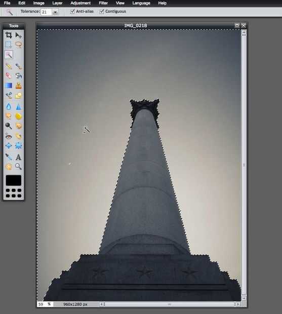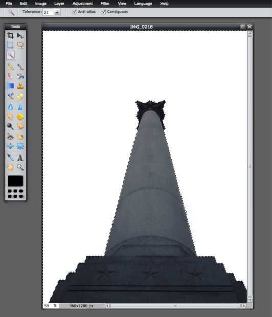 Del mismo modo, imágenes reales como el monumento que he incluido aquí que tienen una composición relativamente simple con sombreado sencillo se pueden cortar fácilmente hacia fuera. Empiezo con un solo clic de la varita mágica. Hacer clic en el área del cielo fuera el monumento un par de veces más mientras mantiene pulsada la tecla shift y era capaz de seleccionar toda el área * fuera * del monumento. Inicialmente, la varita mágica sólo recogió algunas de ese cielo, pero varios clics me tiene bastante fácilmente al punto donde había seleccionado todo y el monumento. Decidí cortar la zona que había seleccionado, la zona exterior del monumento, de la imagen. Viola. He recortado el monumento y lo aislado.