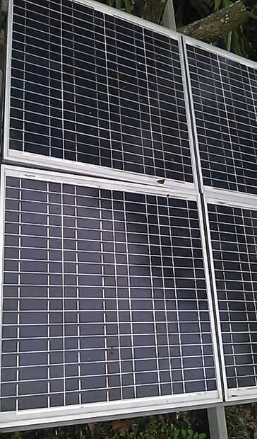 Solar panel(s): 50W, preferiblemente hasta 200W o más, especialmente en climas del norte de menos sol. Un panel de 50W 'mono' es alrededor de 4 pies cuadrados. Mono y polivinílico dan la mayor longevidad y eficiencia energética, mientras que el estilo de carga de Puerto barato tipo 'amorphis' (a evitar). Recibí mis paneles de 4 x 50 vatios en 1 dólar por vatio de un distribuidor de hobby.