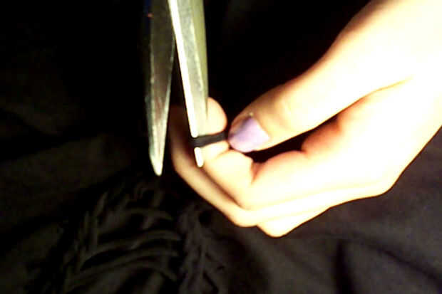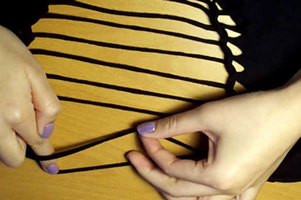 Nudo: cuando usted está sosteniendo en el último bucle en la parte inferior de la V, tijeras y cortar el lazo por la mitad. Nudo doble dos de ellos al bucle anterior para sostener el tejido.