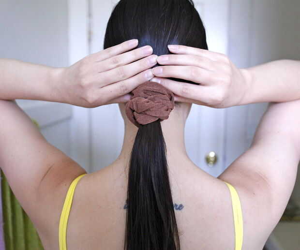 Luego use el scrunchie para atar el cabello en una cola de caballo baja - a la derecha en la parte superior de su cuello. Asegúrese de que se trata en medio de la cabeza!