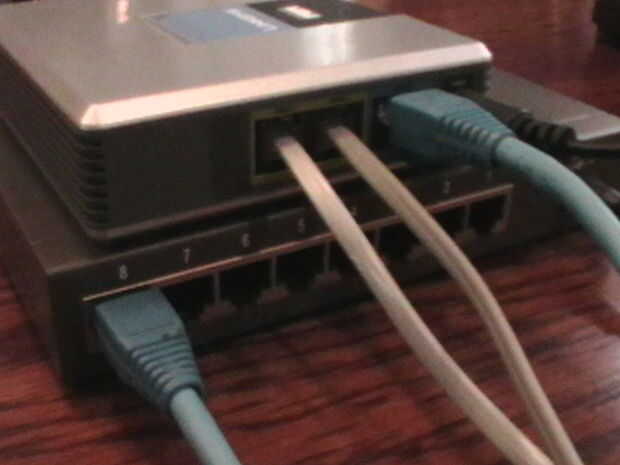 Aquí está una captura de la parte posterior del interruptor y el PAP2T. Conecte un teléfono en cada línea y el conector ethernet en el switch o hub. Si usted está conectando el cableado existente de la casa, asegúrese de que la línea no tiene relación con ningún otro adaptador de VOIP o la compañía telefónica.