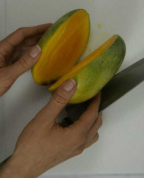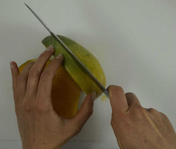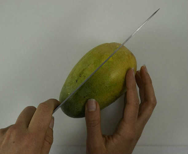 no tienes que pelar la piel y ya no tendrás que perder alguno de la 'carne'.Cortado por el mango a lo largo, twist, cuchara de la semilla y comer!Paso 1: Cortar Mango Paso uno: el mango debe estar maduro o mitad-madura.Use un cuchillo para cortar tod