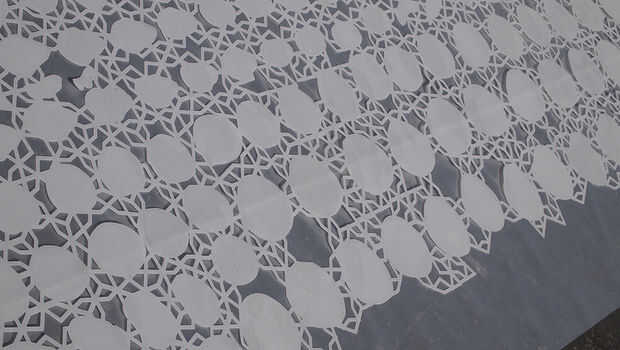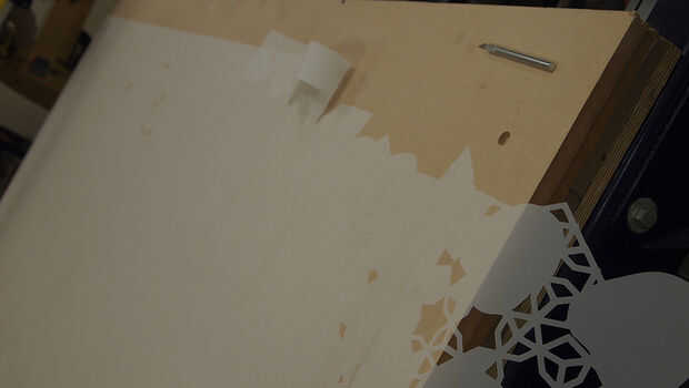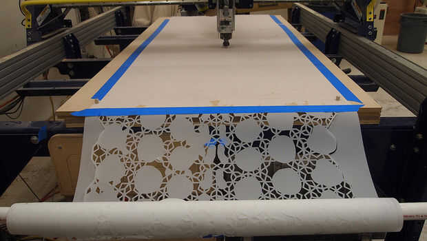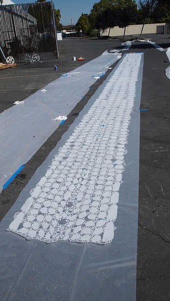 ver fotos de referencia. Técnica implica cuting del diseño en secciones de 7 pies a la vez, usando el adhesivo scotch y el vacume presionado el mylar. Los tacos de madera ayudar a registrar el diseño entre los cortes. sobre la técnica funcionó muy bien.