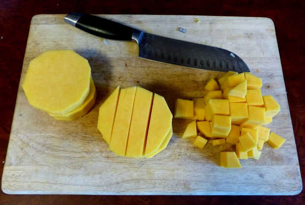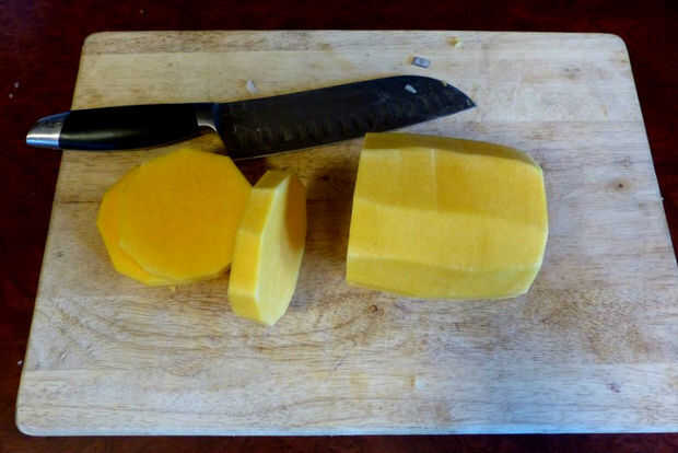 La mejor parte de la calabaza, el cuello, es la más carnosa. Pelar y picar en esta sección: