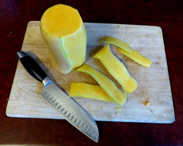 3. Una vez que se pela el cuello entero; Coloque la calabaza en su lado;