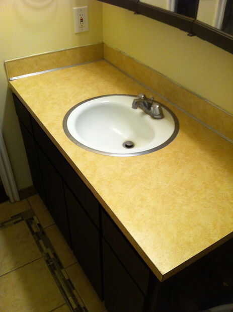 Remodelación de nuestro cuarto de baño y necesita un nuevo fregadero y encimera. Quería una tapa de granito pero no tenía dinero para gastar $300 + para conseguir uno. Así que esto era nuestra solución.