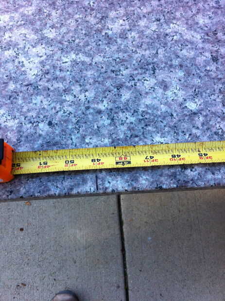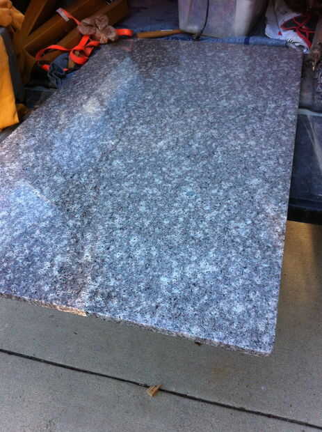 Siguiente tuvimos que cortar el granito a nuestra vanidad. En nuestro caso la losa debe ser de 22" de profundidad y 49" amplia. Así que dio vuelta la losa derecha encima y comenzó a marcar las líneas de corte. Asegúrese de que corte los lados apropiados para que el borde acabado original se expondrá en la tapa de la vanidad. Otro sabio acabarás con feo corte los bordes hacia afuera.