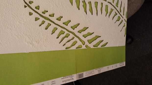 Después de que había puesto el pegamento, los tableros de carteles blancos fueron rociados con el pegamento y las piezas helecho dejó y presionado en el lugar. Luego vino la parte frustrante, muy pegajosa - tratando de cortar alrededor de los bordes de un cartel aún pegajoso con un cuchillo de la maquinilla de afeitar. UGH. Resulta que el pegamento tarda sólo segundos en virar, pero aproximadamente una hora para ser completamente seco al tacto - una hora no queremos esperar. Mala elección. Podría han solo usaba tijeras buenas en un corte recto, pero para evitar el papel de la peladura o corte hacia adentro en las secciones de hoja abierta, decidí que un cuchillo de la maquinilla de afeitar sería más fácil. Y es cierto que no era difícil de cortar a través de la Junta de papel y cartel de arte, incluso con el pegamento. No, era la falta de una tabla de cortar suficiente tamaño que hace la vida dolorosa. Nuestra tabla de cortar grande solo es cristal texturizado - grande para rebanar carne con cuchillos de cocina de cerámica o de acero, pero la muerte en los bordes de la maquinilla de afeitar - y mi buen autoregenerable almohadilla de corte de caucho era quién-sabe-donde, por lo que recurrí a uno de la pequeña cocina plástico tableros de corte. Significaba cambiar la placa cada 30 segundos - que aun conseguido arañar la mesa estaba utilizando algunas veces - y realizando un punto molesto...