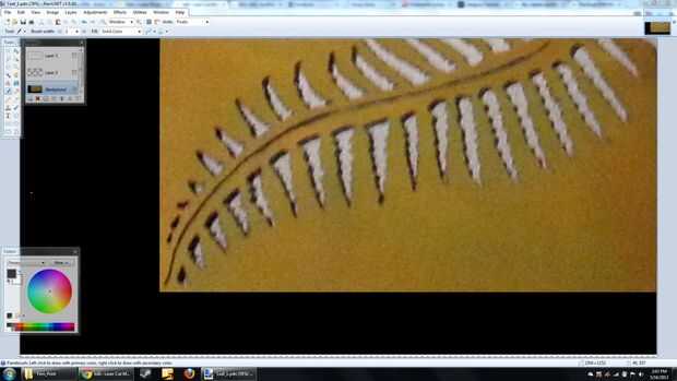 Así! Para obtener este archivo se ejecuta tan rápido como sea posible (ya que había pensado los estudiantes querrían cortes antes de vacaciones de primavera... Yo era optimista por tres semanas), hice algunas foto simple manipulación usando mi programa favorito de la partida, Paint.net. No tan poderosa como GIMP o Photoshop, pero no soy un fan de plugins personalizables por el mal del primero o precio el último y Paint.net es más que suficiente para llegar al siguiente programa (Inkscape). Mi primer paso fue cortar una sola tarjeta de la foto y lo tamaño sería a la plantilla de madera corte láser (24 "x 12" x 1/8" madera contrachapada del abedul). Esta tenía dos ventajas de lado - en primer lugar, no tengo que lidiar con vector escalar en Inkscape (bien es muy precisa, es muy fácil perder un solo nodo y enrosque su imagen) y en segundo lugar, filtran detalles innecesarios. Generalmente esto no sería una buena cosa, pero esta imagen había ampliada las sombras en la pared, que eran representaciones mejor de bordes ondulación de fern.