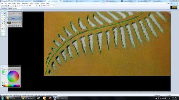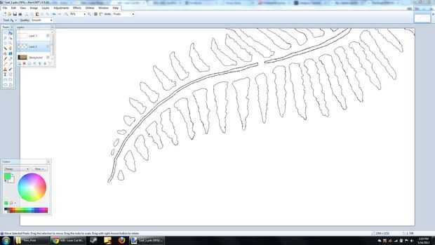 La tercera y última capa (diseño de vector-path) fue construida por copiar la segunda capa y comando toda la página en blanco y negro para mostrar sólo los bordes. Por desgracia, mi programa de paths de vectores (Inkscape) no le gustó mi formato - tuve algunos bucles no cerrado, por lo que no detecta los bordes correctamente y mi grosor de la línea varió demasiado a desarrollar una trayectoria buena, de una sola capa. Por lo tanto mi Epifanía - he leído en tutoriales de Inkscape sobre una opción de detección de bordes diferentes que traza mapas de bits en lugar de usar el plugin había estado trabajando con. Yay, mapas de bits son fáciles de generar. Así que llené en los bordes en Paint.net para crear una silueta de alto contraste-esque mapa de bits (BMP). Para las otras dos hojas, simplemente "mágica varita" seleccionado todo pero los agujeros, entonces invertido mi selección para los agujeros de color negro puro, dando una silueta grande, precisa. Problema resuelto!