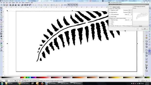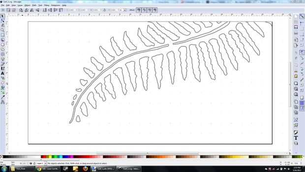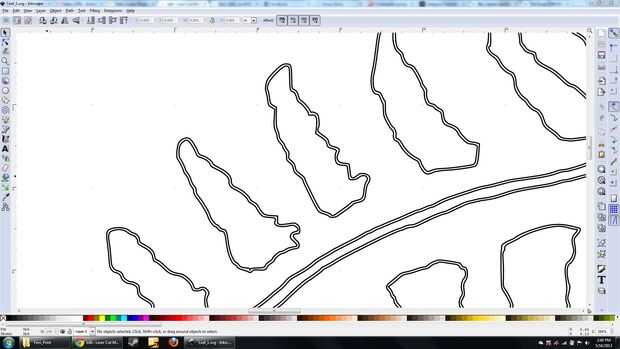 Este es un problema si se trabaja con detalles muy finos (es decir, incrustaciones que necesitan tolerancias < 0,01"- sólo utilizar una salida directa de CAD están bien apretados), pero en este caso, resultó para ser una bendición en disfraz (siguiente paso!). He intentado borrar los caminos internos, pero en Inkscape es un dolor para seleccionar bucles cerrados y nada más. Lo que sea... Representé que o el láser haría los cortes correctamente, una buena oportunidad para probar el láser tamaño y resolución, o a quemar el exceso, creando piezas de deserción agradable. Así que en lugar de limpiar completamente la imagen, sólo exportan como un DXF y llamada un día.