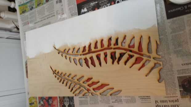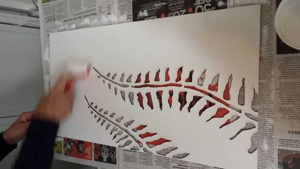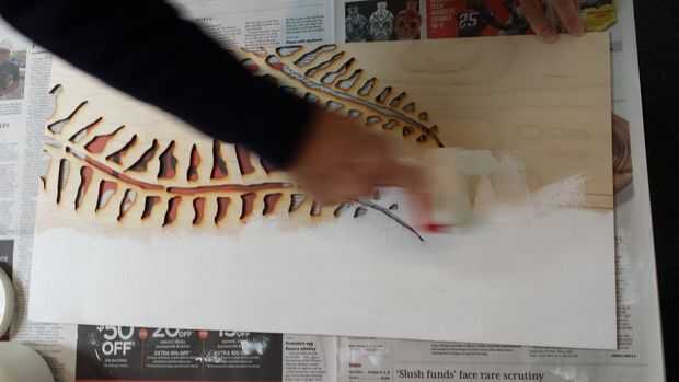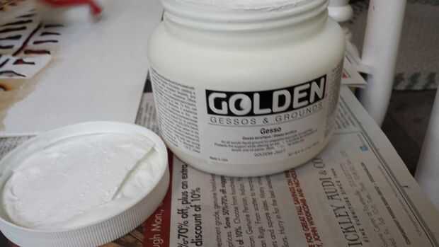 Pero antes de todo eso, los consejos necesitan para ser coloreado. En lugar de pintura, eligieron dos medios - Gesso blanco (mi madre las pinturas en aceite-acrílicos y utiliza esto para la preparación de la lona) y pasta de modelar. El Gesso se aplicó primero con un rodillo para una capa de imprimación agradable, luego la pasta de modelado fue agregada con un tenedor de plástico (para obtener manchas irregulares en su lugar) y alisa con un rodillo. Esto le dio una textura de estuco a las juntas que refleja el techo bien y descompone la luz en la superficie, agregar un poco de profundidad a la pieza. Esto puede verse mucho más claro en las fotos en el siguiente paso.