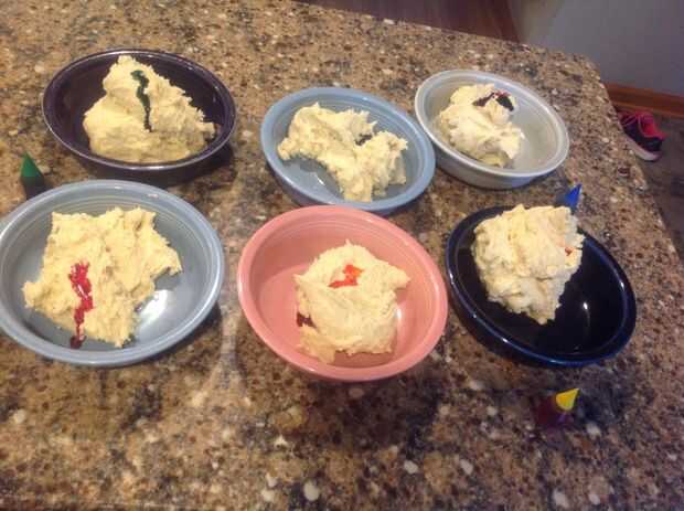 Dividir la masa en bolas. el número de tazones de fuente dependerá de la cantidad de colores que decida utilizar. Hoy usé 6 colores, rojo, naranja, amarillo, verde, azul y púrpura. Añadir colorante a cada bola de masa y mezclar hasta obtener el color que desee.