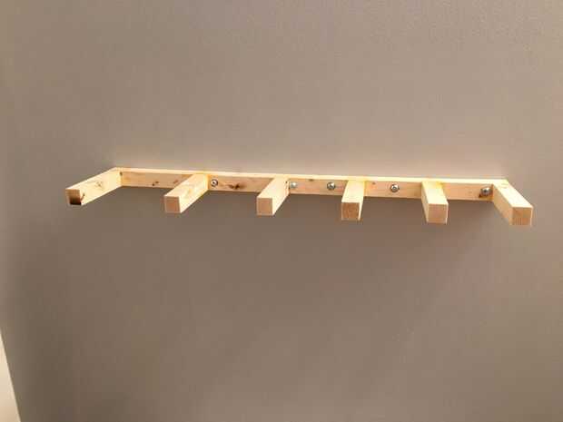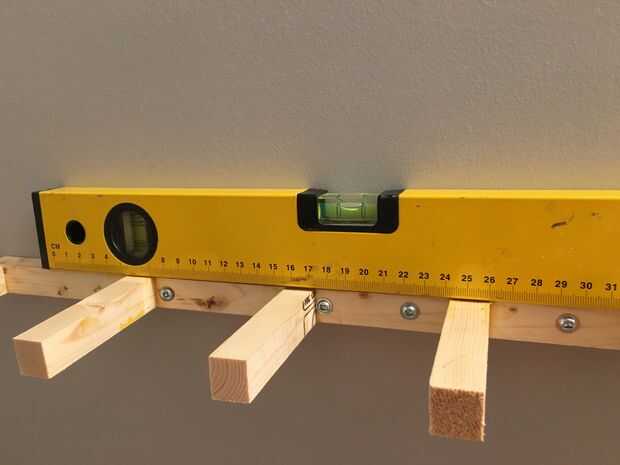 medida donde usted desee Coloque el estante, encontrar un poste de madera y asegúrese de al menos un tornillo pasa a través de la rodillera y el espárrago. Nivelar el soporte, tornillo en 5 o 6 tornillos y deslice el estante sobre el soporte.