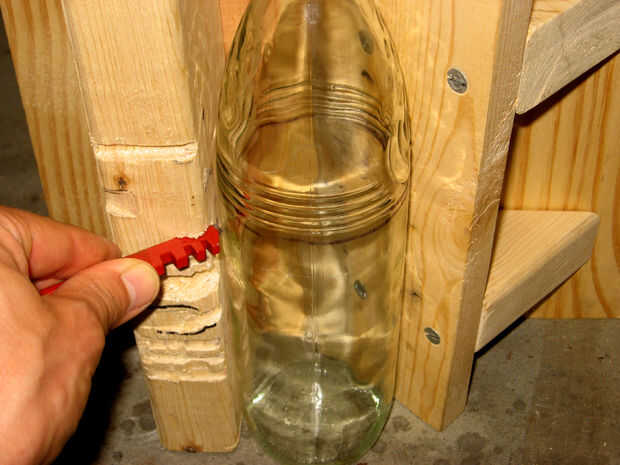 Como he mencionado anteriormente, esta botella fue muy irregular. Tan irregular de hecho, eso él se negó a girar uniformemente en la plantilla. Esto creó un problema, como la manera de mantener la botella a uno de sus tres ejes (el eje Y) es por gravedad. Para resolver este problema, quitar la clavija que se muestra en la burla 123d y en foto 2 arriba, inclinado la plantilla vertical y permitió la base de la botella para apoyar en el suelo del garaje. Generalmente yo dibuje una línea con un Sharpy donde voy a cortar, pero en este caso, ignora la línea y cortar un poco por debajo de ella. Cuadro 2 muestra una botella que corto de Snapple, acero y fuego verde instructable. Esto es lo que yo suelo utilizar la plantilla de la botella. Es un poco más fácil de controlar que el método vertical, sans peg (ver recuadro para el cuadro 2).