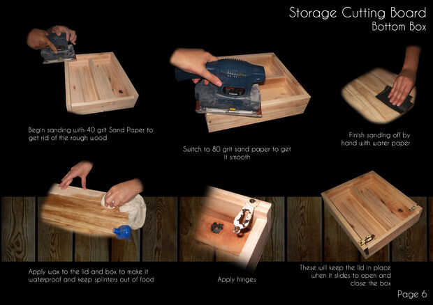La caja de arena hacia abajo para el acabado final. Empecé con un 40grit y luego se trasladó a un 100grit. Después de esto terminé lo a mano con papel de agua. Entonces encerado la caja para impermeabilizar la madera. Esto también evitará las astillas de saltar y termina en la comida que está preparando. Luego até las bisagras viejas encontré. Estas bisagras mantienen la tapa del depósito.
