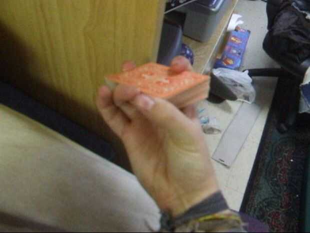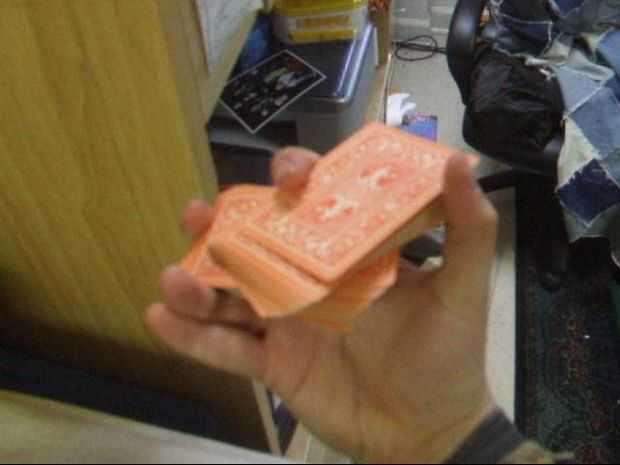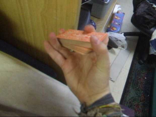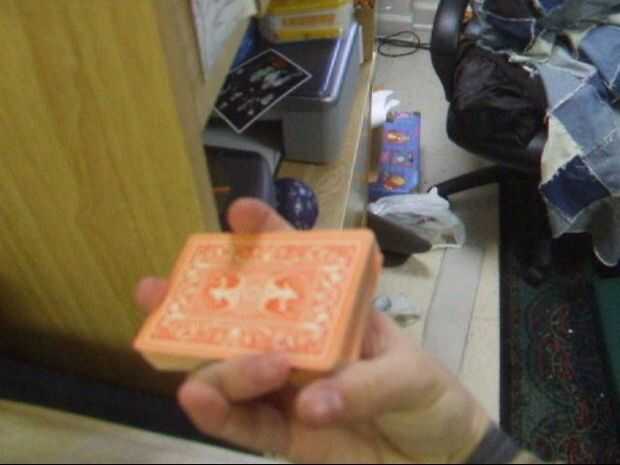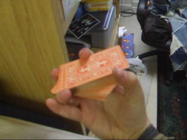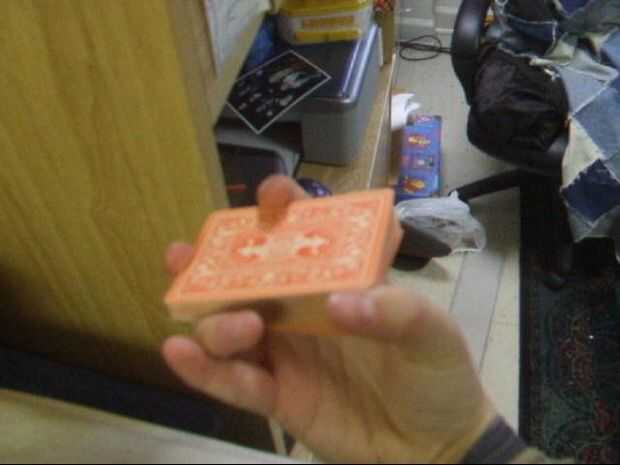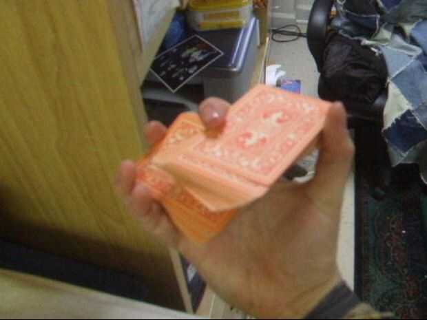 Con el pulgar, arrastre la mitad superior de las tarjetas a través en la dirección opuesta como antes. El dedo índice hay que hacer a una especie de cosa giratoria para que su articulación principal (una menor) mantiene la presión en la mitad inferior de la cubierta (junto con el dedo del anillo), y al mismo tiempo, el área entre las dos articulaciones superiores del dedo índice presiona en la parte superior la mitad junto con el pulgar. En ambos casos, el dedo índice queda en el centro del lado largo.