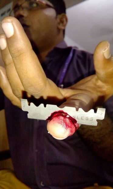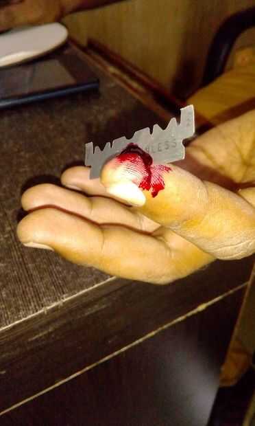 5 - es todo hecho, aplicar tinta roja o sangre lo que se verá como la sangría de dedo.