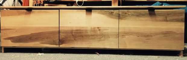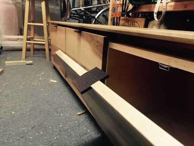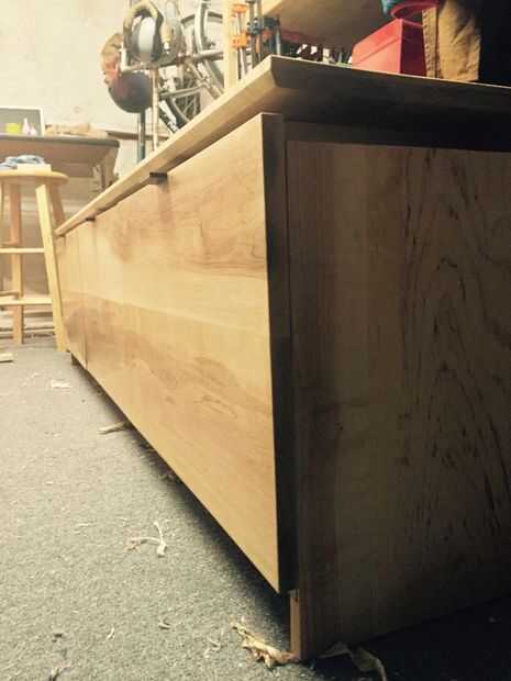 Esta manija fue una solución de diseño para un banco recién terminada de gabinete. El diseño de la pieza tenía una estética moderna minimalista que se centraba en la belleza del grano del arce sólido sobre superficies pulidas, sin interrupciones. El mango debe hacerse de forma discreta para no perturbar el grano que fluye en las caras del panel de la puerta. También proporciona protección a la pieza. Puesto que las puertas se abren hacia abajo, las manijas crean un en un descanso de la puerta completamente abierta para que será no hiperextender y demasiado hincapié en las bisagras.