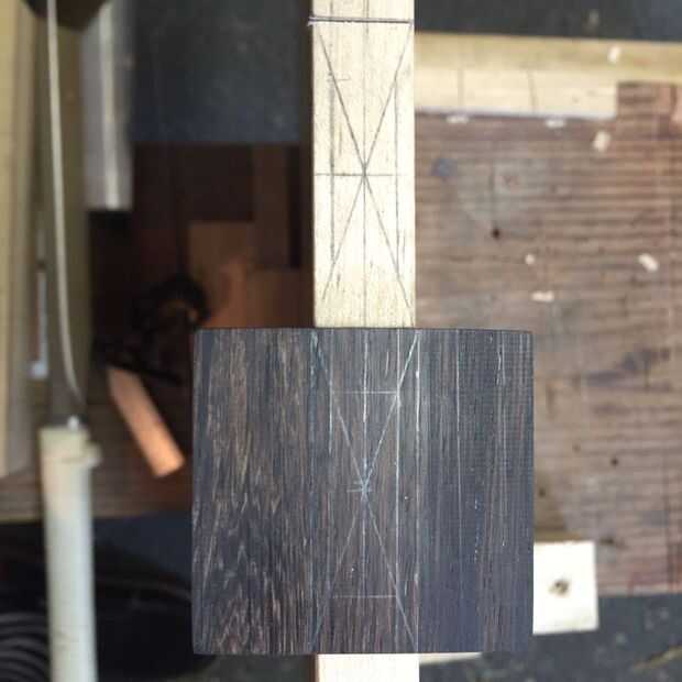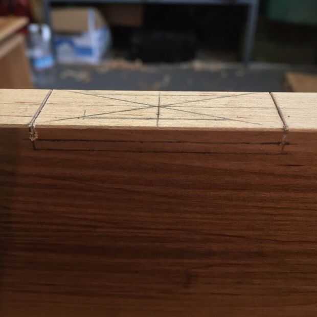 La articulación es esencialmente un empalme de regazo de forma que proporciona mayor contacto de superficie (y por lo tanto una articulación más fuerte) para pegar cortar. Así que la profundidad de la vuelta de la manija debe ser la mitad del espesor. La profundidad de la puerta debe ser el espesor total y una marca por la mitad el grosor del mango. Véase el cuadro 2