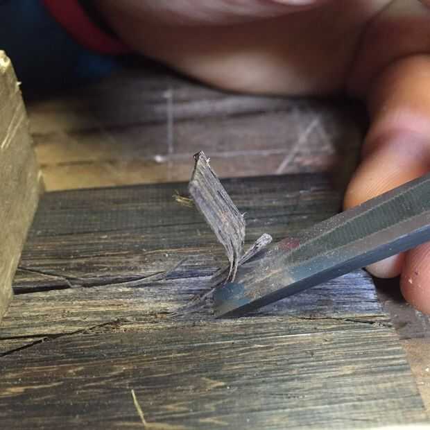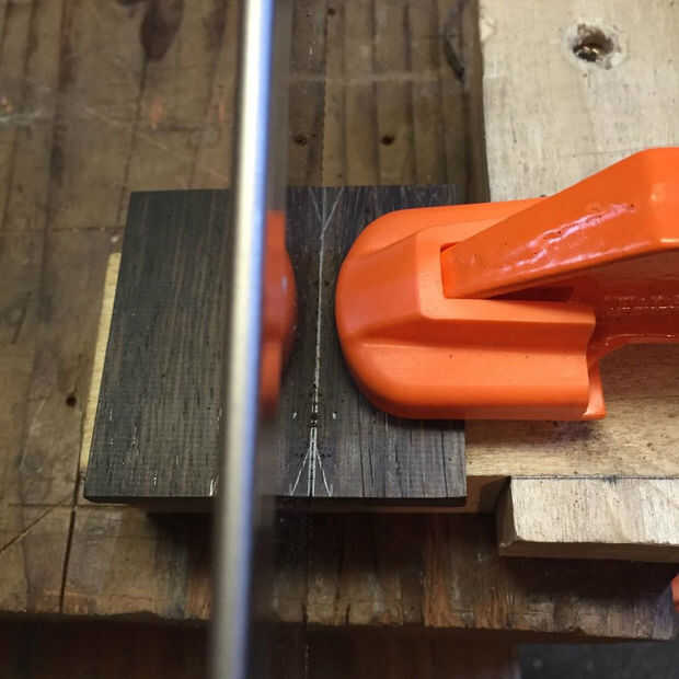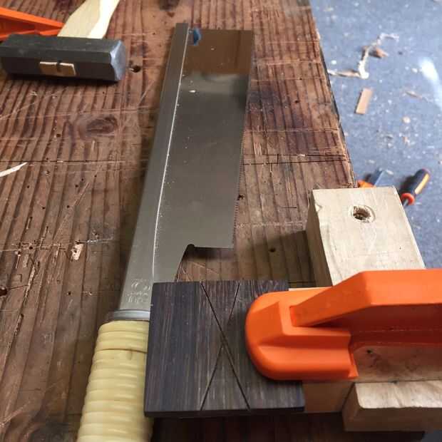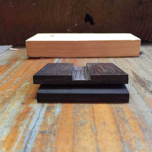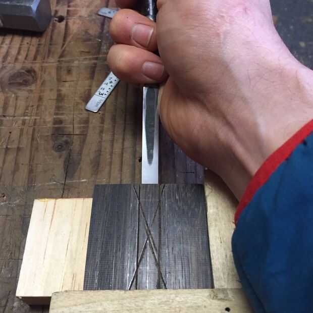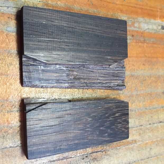 Material Nota: ADVERTENCIA: tener mucho cuidado cuando se cincele en materiales finos de granos rectos. Preste atención a las propiedades de la madera que usted elija. En este caso ébano es muy denso pero también muy frágil, el más fino es el más probable a dividir. Partí un mango porque había cincelado incorrectamente cuadro 7. Partir también es un riesgo al hacer el montaje seco. Si está demasiado apretado, forzarlo puede causar la madera dividir por el grano.