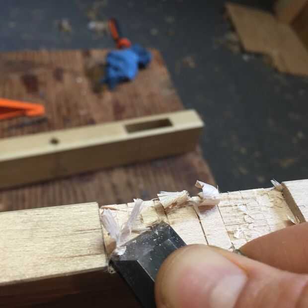 Primero necesitas cortar un simple empalme de regazo a la marca a la mitad del grosor de la empuñadura. El siguiente paso es recortar la forma de espiga que refleja la forma de la manija que sólo empotrados