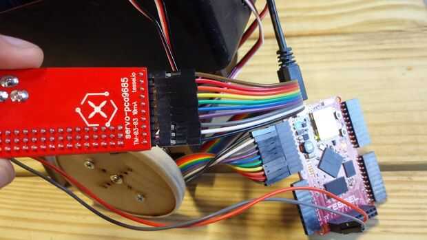 4. Usando los dos cables restantes para ejecutar el poder de la Tessel al módulo servo. Esto es un poco de hack y, pero vamos a llegar lejos con él en esta aplicación. Puesto que estás alimentando Tessel de una fuente de 5V (USB de la batería de la computadora especificada), Vin en el Banco de GPIO es 5V. Ejecutar un cable rojo de Vin a cualquiera de los + posiciones en su módulo de servo (sí, el mismo tipo de alfileres que conecta los servos en). También ejecutar un cable de GND GPIO para módulo servo-. Esto significa que no tenemos enchufe en el módulo de servo para fuente de energía externa como hacemos normalmente. Revisa el cuadro y quisiera saber si aún confundido.