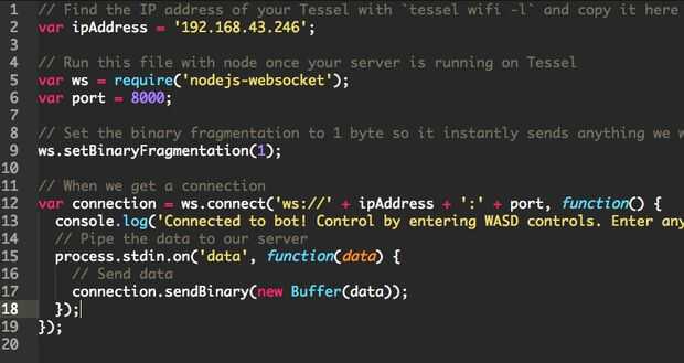 Cuando Tessel se conecta a Wi-Fi, mostrará una dirección IP en la línea de comandos, por ejemplo "192.168.128.117". Cambiar la variable 'dirección IP' en 'client.js' que la dirección IP indicada en la línea de comandos de cuando Tessel conectado a WiFi. Guarde este archivo.