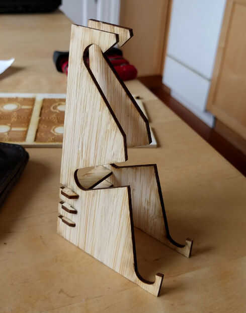Es fácil hacer un teléfono de cartón, pero mina llevaba después de un par de meses, así que decidí laser-corte una nueva material apenas más robusto. Al hacerlo, decidí a hacer unos ángulos disponibles. Me gustaria tener mi celular "de pie" en un ángulo alto cuando video llamadas y me gusta tenerlo "acostado" con un ángulo bajo mientras que los medios de observación.