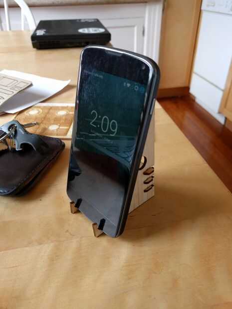 Se trata de un soporte de madera teléfono hecho con madera de 1/8 de pulgada, utilizando la vida técnica para hacer madera flexible de la bisagra. Es ideal para ver películas o espectáculos o vídeos en la orientación del paisaje, pero no puede apoyar